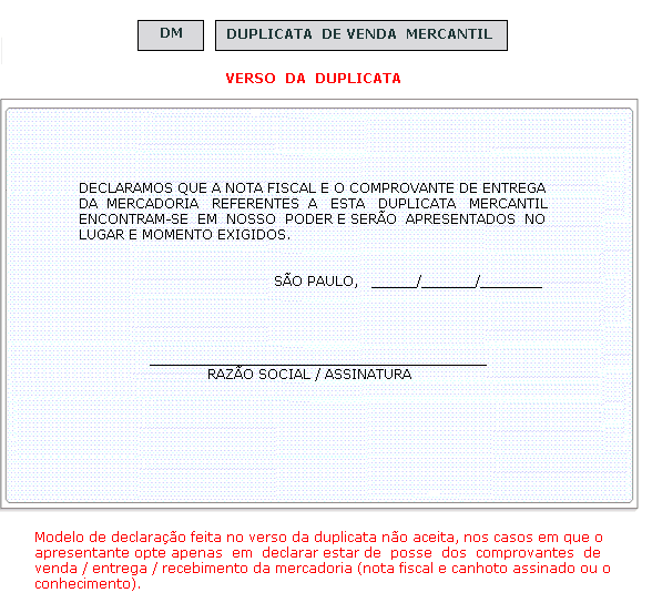 É facultado ao apresentante declarar estar de posse de tais documentos, podendo fazê-lo no verso da duplicata, veja modelo.