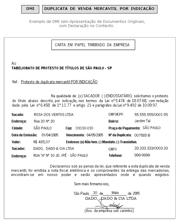 É facultado ao apresentante declarar estar de posse de tais documentos podendo fazê-lo no contexto da duplicata por indicação.