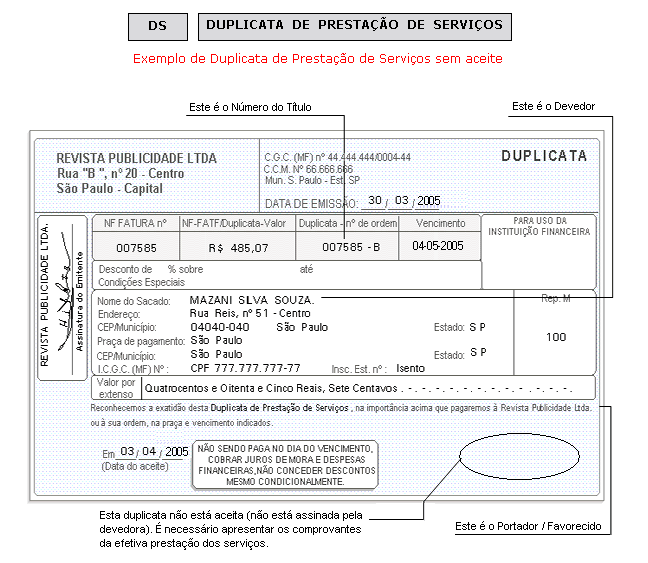 Título original. Quando aceita pelo sacado, nada mais será exigido. Na falta do aceite, a comprovação da entrega dos serviços (nota fiscal com canhoto assinado). Se você receber por endosso uma duplicata, exija os documentos comprobatórios de pedido e entrega dos serviços.