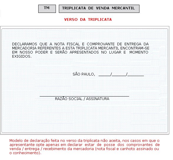 Quando não aceita, deverá estar acompanhada dos comprovantes de venda/entrega/recebimento da mercadoria (nota fiscal e canhoto assinado ou o conhecimento; se forem cópias, deverão estar autenticadas). Veja Modelo